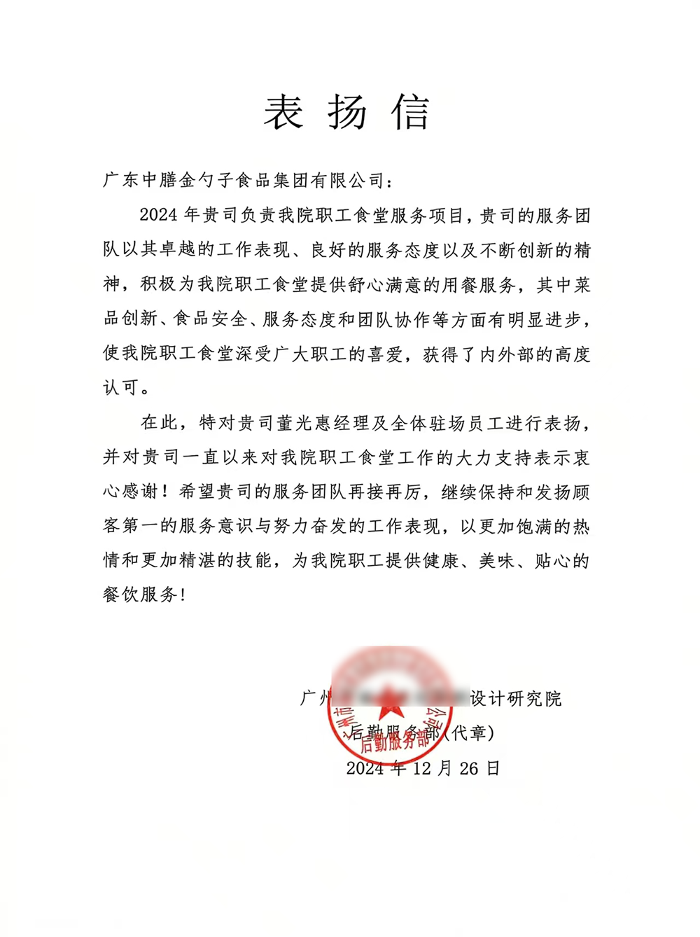 6、2024年7月,金勺子食品集團董事長黃金盾榮獲“2024團餐服務優秀青年企業家”稱號。