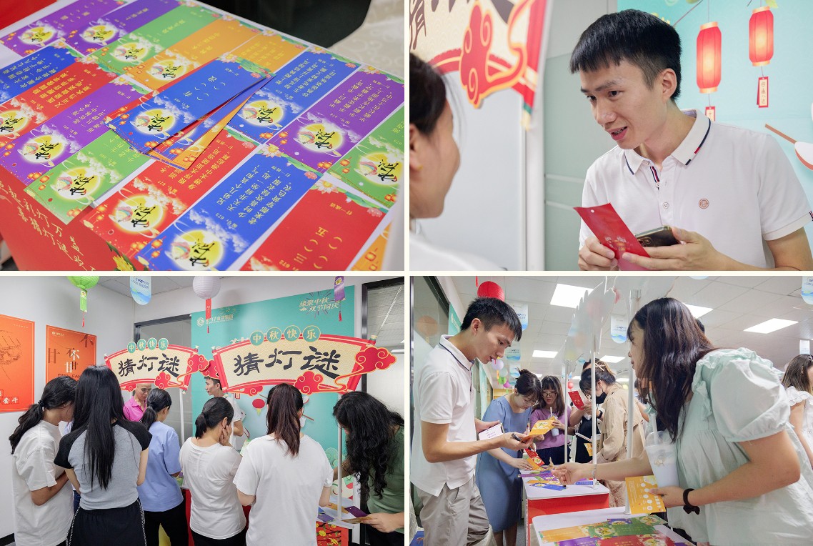 《猜燈謎》如火如荼地進行著,員工們圍繞著燈謎互相討論,氛圍活躍。