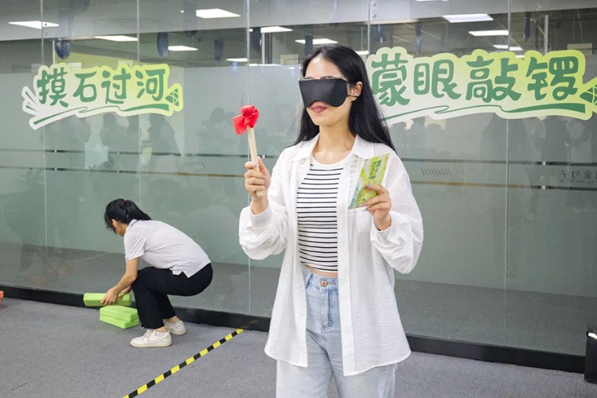《蒙眼敲鑼》游戲中,參與者需在蒙眼的情況下,憑感覺找到鑼的位置并敲響。這一游戲讓員工們體驗(yàn)到了信任與默契的重要性。