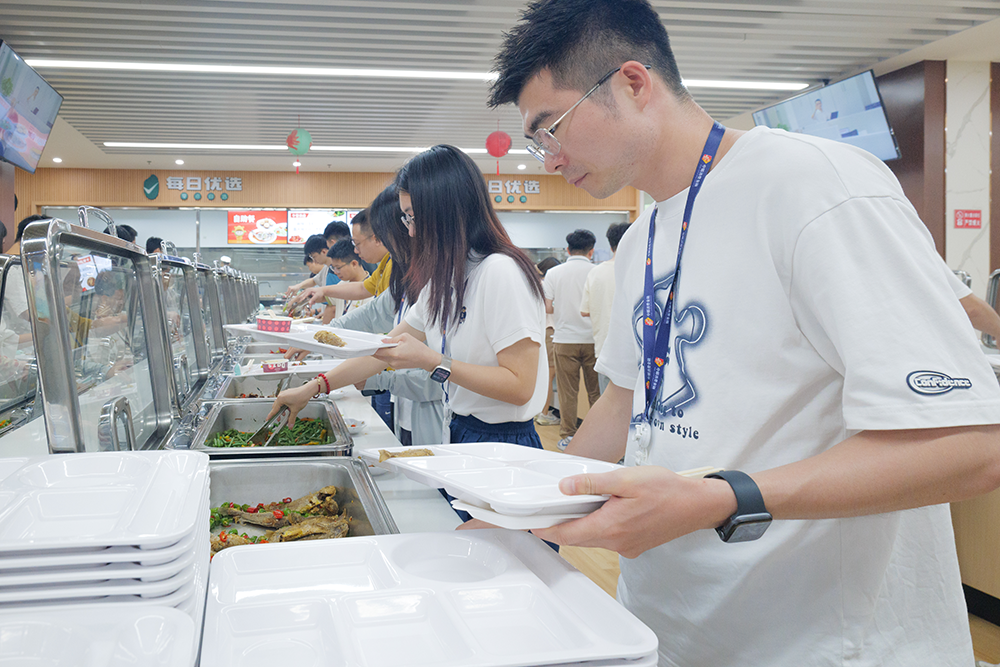 職工們有序領(lǐng)取美食后,圍坐在餐桌旁,品嘗著美食,臉上洋溢著滿足和幸福的笑容。他們相互分享著美食的故事,食堂內(nèi)彌漫著溫馨愉快的氛圍。